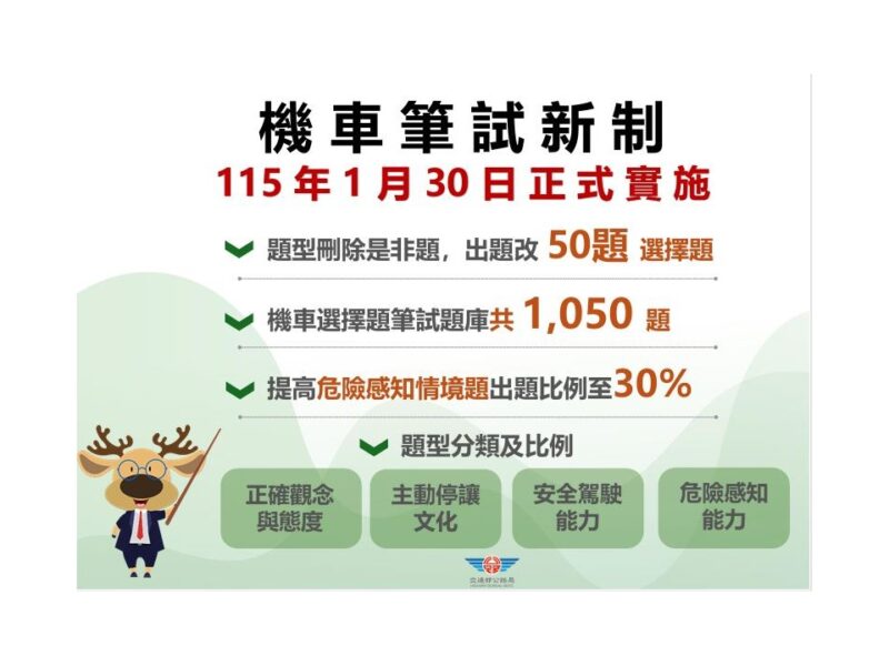 自115年1月30日起實施機車駕照筆試題庫新制,全面取消是非題,統一改採50題選擇題形式測驗。新制題庫共計1,050題選擇題,並導入「以人為本」之核心理念,題型架構分為「正確觀念與態度」、「主動停讓文化」、「安全駕駛能力」及「危險感知能力」等四大類。其中「危險感知能力」相關之情境題與影片題,將由現行10題調整增加至15題,占整體考題比率由20%提高至30%,以強化考生對道路風險之辨識與因應能力。