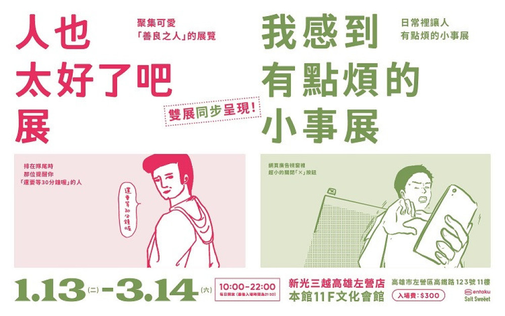 【大成報記者張淑慧/高雄報導】 新光三越高雄左營店2026首波展覽,邀請在日本累積吸引超過 70 萬人次參觀的人氣情感主題展覽系列《人也太好了吧展》與《我感到有點煩的小事展》首登高雄!由東京策展團隊 entaku 打造的《人也太好了吧展》與《我感到有點煩的小事展》,以文字、插畫與照片記錄真實生活裡的小觀察,讓觀眾在展場中,看見那些平常被忽略的溫柔與情緒,重新感受日常的可愛。