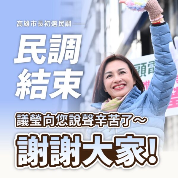 【今傳媒/記者李祖東報導】高雄市長初選民調於今(12)日晚間順利完成。高雄市長參選人邱議瑩表示,感謝每一位守在電話旁、耐心接聽民調的市民朋友,也陸續收到許多支持者回報接到電話,對大家的關心與支持,心中只有滿滿的感謝。