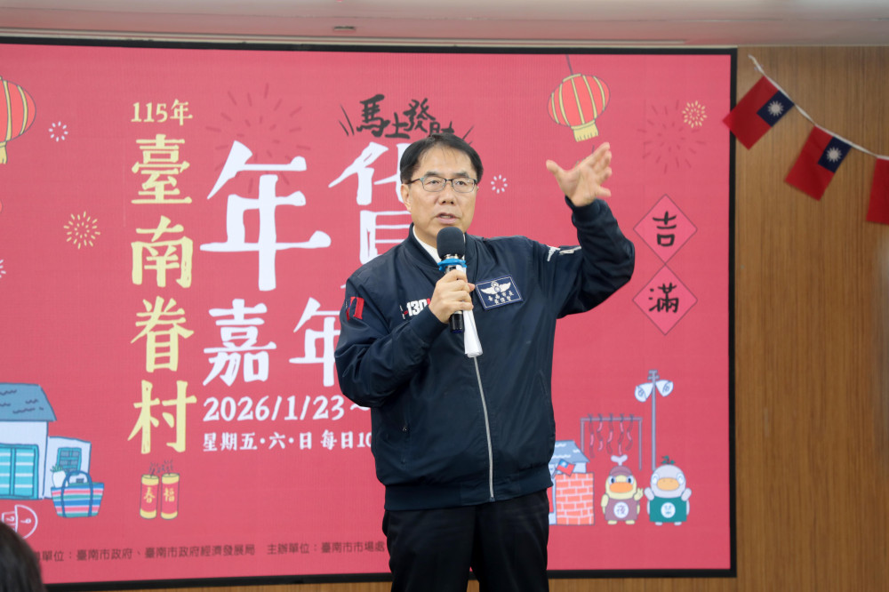 【大成報記者杜忠聰/臺南報導】農曆馬年將至,台南市政府首度於永康區舉辦「115年台南眷村年貨嘉年華」,活動訂於1月23日至25日上午10點至晚間9點,在永康區永華路(永興路至永平街路段)及探索教育公園登場。14日下午,市府於永華市政中心舉辦記者會,由財神爺熱舞開場並發送糖果,市長黃偉哲親臨出席,邀請市民走進眷村舊時光,在年貨採買中感受濃濃年味與人情溫度。