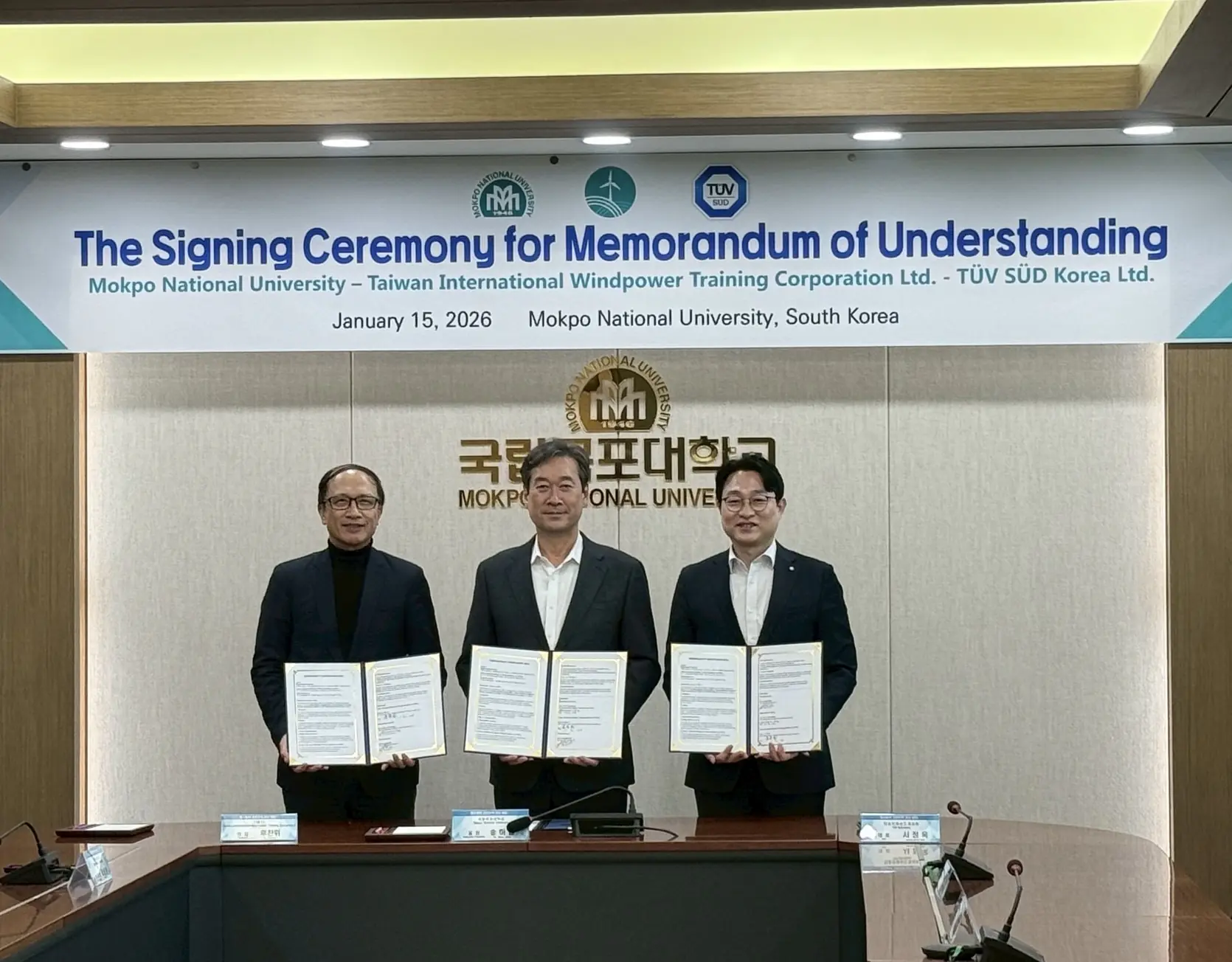 臺灣港務公司(簡稱港務公司)轉投資事業臺灣風能訓練公司(TIWTC,簡稱臺灣風訓公司) 115年1月15日攜手南韓學術單位國立木浦大學及國際認證公司TÜV SÜD Korea,於南韓國立木浦大學舉行三方合作備忘錄(MOU)簽署儀式,宣布將於南韓風電核心地帶全羅南道共同打造具備國際認證量能的 GWO (Global Wind Organization 全球風能組織) 培訓中心。