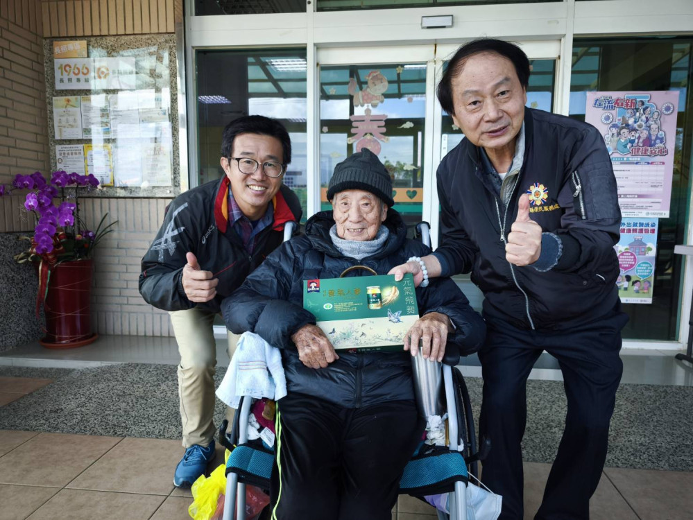 劉副處長一行首站抵達「南門護理之家」,探視單身住院榮民謝伯伯與徐伯伯;劉副處長親切詢問伯伯們的健康與生活狀況,並與機構醫護人員交換意見,確保長輩在冬季能獲得完善照護與保暖措施;為表達對長輩敬意與關懷,副處長代表服務處致贈養氣人參營養禮盒,祝福長輩在新的一年身體康健、平安祥和。