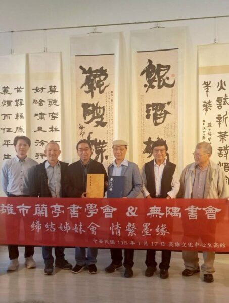115年1月17日(六)14:00舉行開幕,其中有一項特別活動,即無隅書會與高雄市蘭亭書會締結為姊妹會。兩書會結盟,不僅為開幕儀式帶來人潮盛況,且有助於兩書會日後的交流切磋、研究分享及推廣。當天還安排書法日課分享,在輕鬆聊天和對話中,無私無保留的分享會員們累積多年的書法學習、比賽、研究、創造的經驗,為浩瀚無垠的書法藝術盡一份棉薄之力。