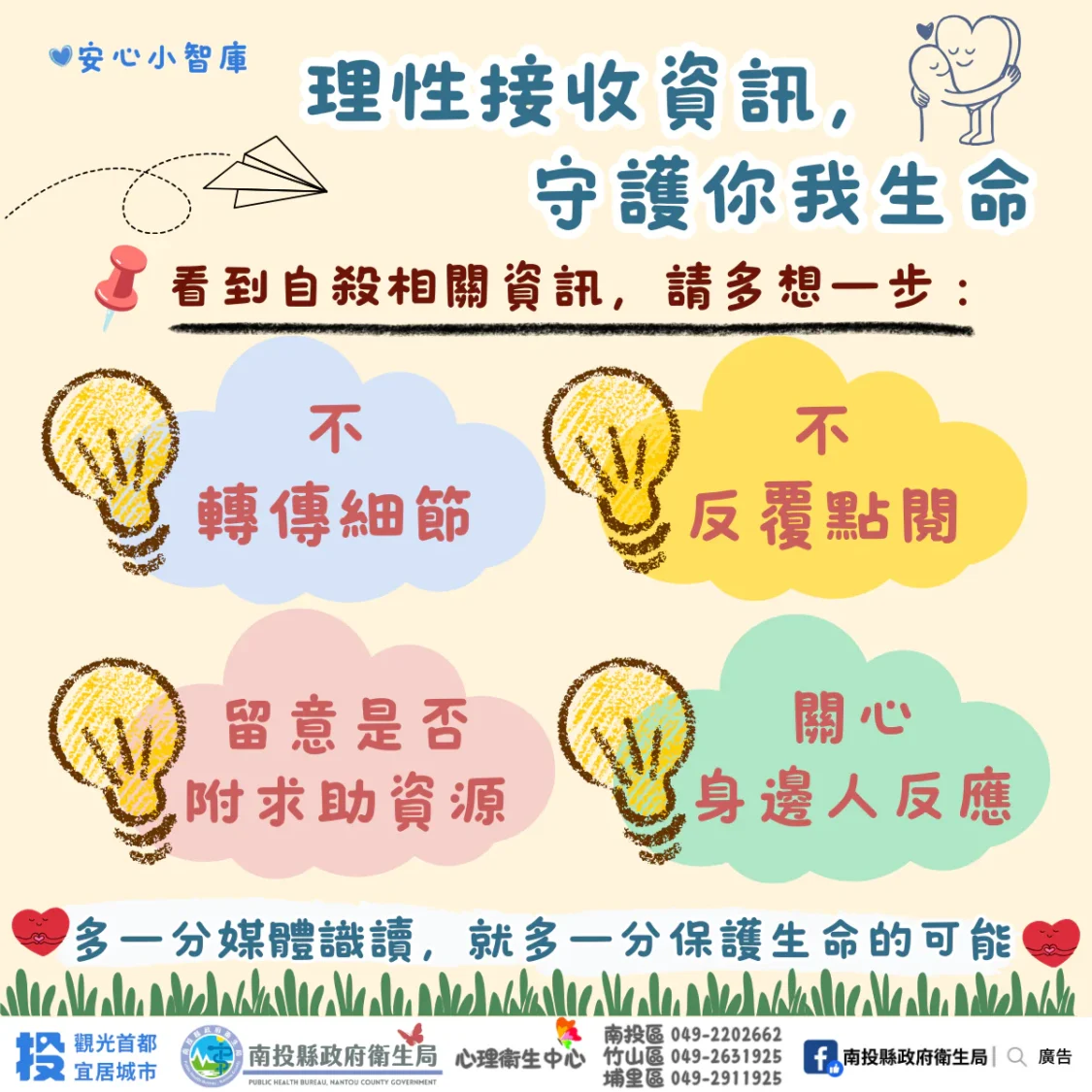 新聞不只是事件的轉述,也可能在關鍵時刻對一個人的生命產生影響。南投縣政府衛生局長陳南松呼籲,自殺相關新聞的報導與閱聽,皆應遵衛生福利部「八不、六要」的原則,包括避免使用聳動化標題、不詳細描述自殺方法、地點與遺書內容,不刊登照片、影片、音訊或社群媒體連結,也不簡化自殺原因、歸咎於單一事件;同時應提供正確且即時的求助資訊,特別謹慎處理名人自殺事件與遺族訪談,並透過報導面對壓力、尋求協助的真實故事,傳遞希望與復原的可能性,也提醒媒體從業人員在報導相關事件時,自身亦可能承受心理影響,更需重視自我照顧。衛生局指出,在高度即時與大量轉載的媒體環境中,自殺相關新聞如何被書寫與呈現,對正處於人生低潮的人而言,可能成為被看見、被理解,並進一步連結到求助資源的契機,新聞不只是新聞,還能成為茫茫大海中的一根浮木。