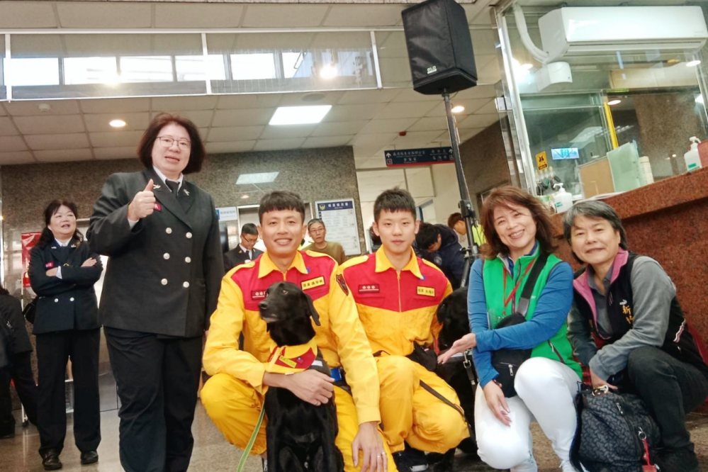 ▲「115年消防、義消及救難志工人員119捐血」活動盛大登場,新竹捐血中心組長黃莉雯(右1)、工作人員黎怡君(右2)、竹市義消婦女大隊大隊長徐美惠市議員(左1)和竹市消防兄弟暨搜救名犬一同合影。