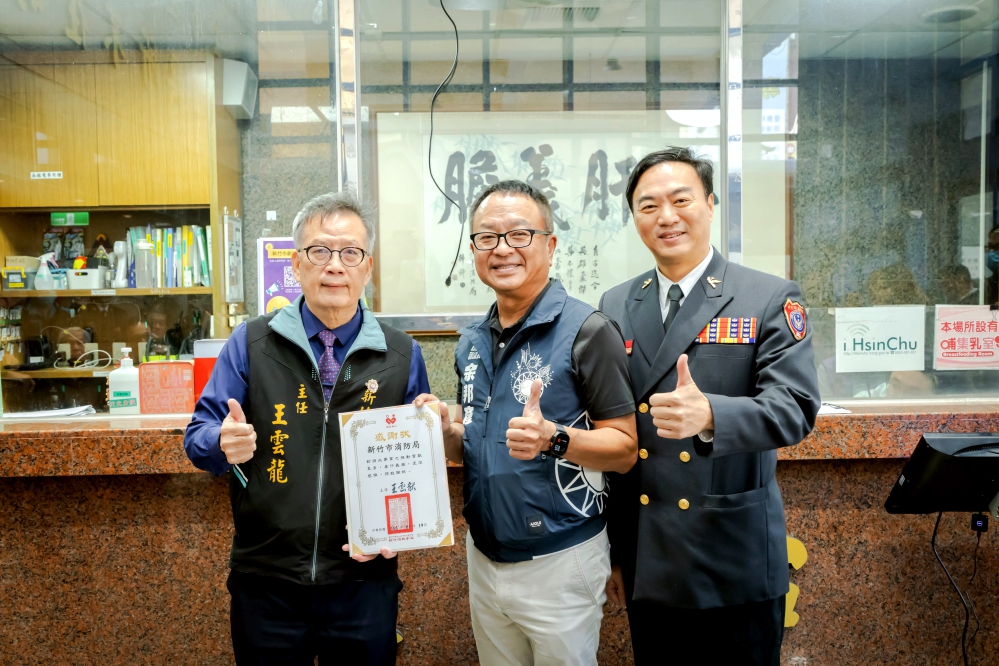 ▲「115年消防、義消及救難志工人員119捐血」活動盛大登場。新竹捐血中心主任王雲龍(左)致贈感謝狀,並和消防局長李世恭(右)、竹市副議長(中)一同合影。(圖/竹市府提供)