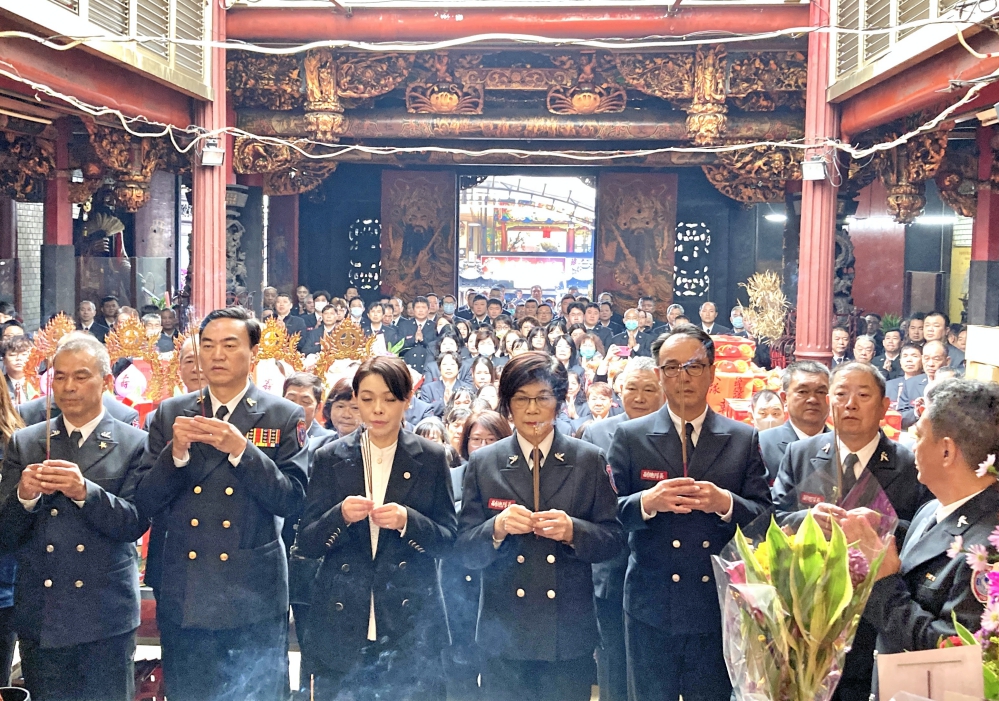 ▲「115年消防、義消及救難志工人員119捐血」活動盛大登場,高虹安市長與、消防局長李世恭與義消總隊副總隊長鍾淑英帶領警義消幹部於新竹都城隍廟舉行上香祈福儀式。