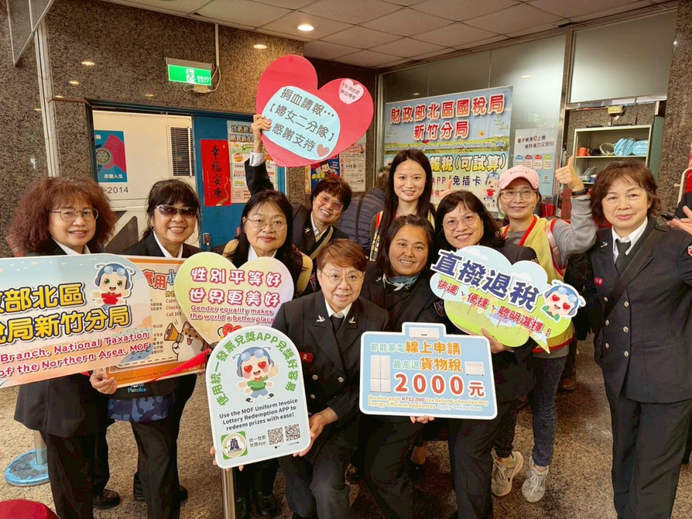 ▲「115年消防、義消及救難志工人員119捐血」活動盛大登場,新竹國稅局再次共襄盛舉並於現場設攤透過有獎徵答等寓教於樂方式,向現場捐血民眾宣導各項稅務政策政令,同時竹市義消婦女大隊隊員們一同熱情參加宣導。