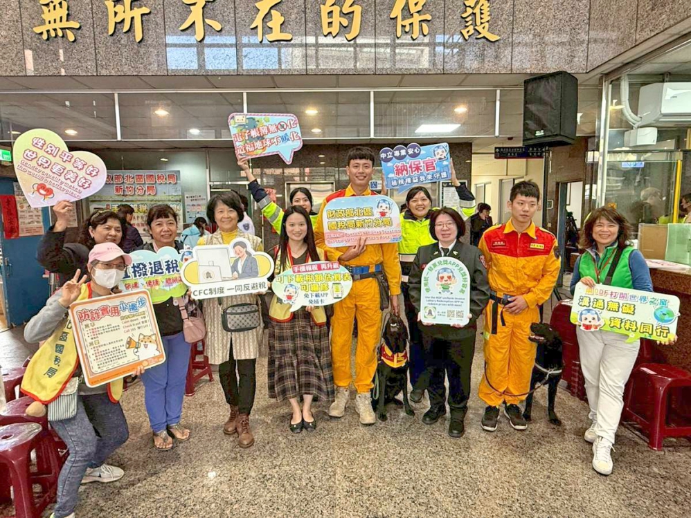 ▲「115年消防、義消及救難志工人員119捐血」活動盛大登場,新竹國稅局再次共襄盛舉並於現場設攤透過有獎徵答等寓教於樂方式,向現場捐血民眾宣導各項稅務政策政令,同時竹市義消婦女大隊大隊長徐美惠市議員(前排右3)、消防兄弟及民眾更是熱情率領隊員參加稅務宣導活動。
