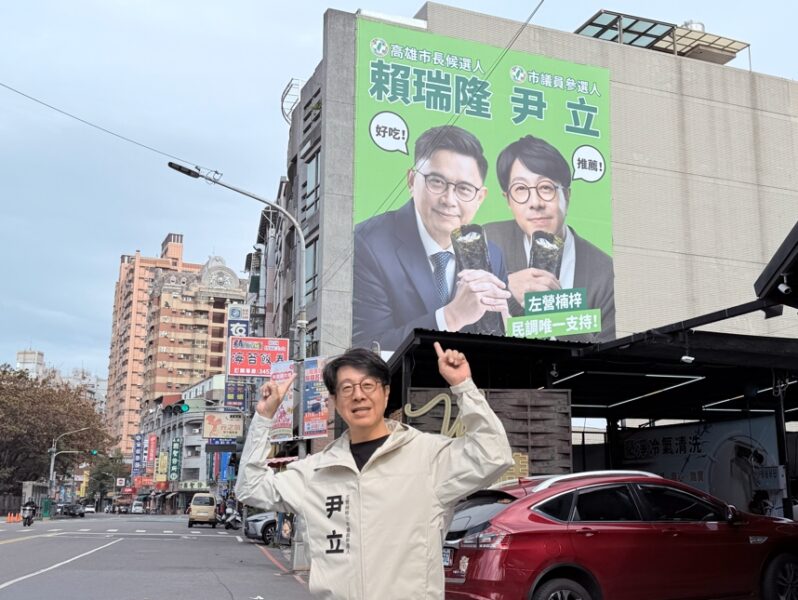 【今傳媒/記者李祖東報導】高雄市長民進黨內初選甫落幕,地方選戰熱度迅速升溫,各式參選人看板陸續上架,街頭也悄悄展開「搶看板大戰」的視覺競逐。左營、楠梓市議員參選人尹立,推出第一面與通過高雄市長初選的立法委員賴瑞隆同框看板,不走制式嚴肅路線,而是以幽默巧思,走出截然不同的風格。
