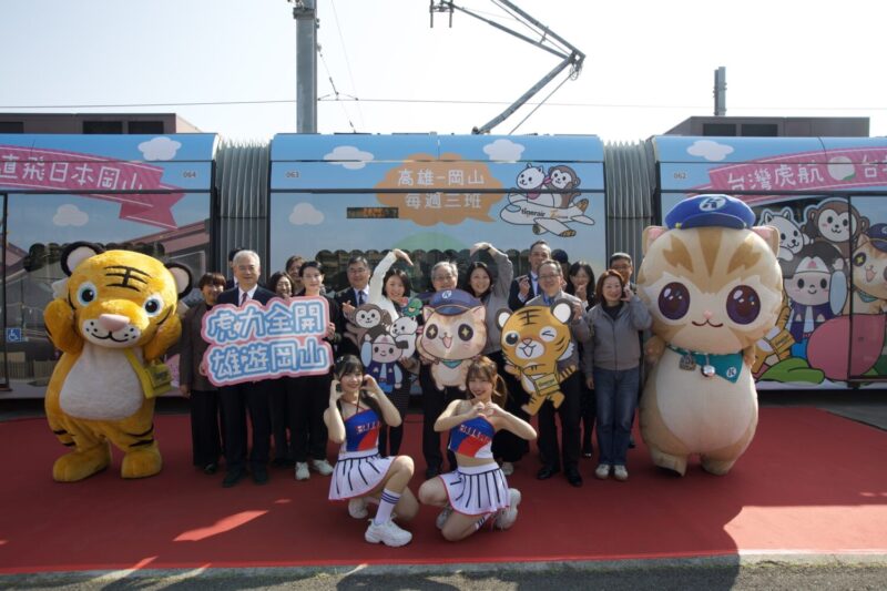 今(22)日上午於高雄捷運輕軌機廠內盛大舉辦「虎力全開・雄遊岡山!」台日三方旅遊彩繪輕軌啟動記者會,由蜜柑站長領銜好朋友虎將擔任開場表演擔當,可愛又淘氣的模樣瞬間將現場氣氛拉升到最高點,高捷公司楊岳崑董事長表示:「本次活動以台日三方可愛角色串聯兩地觀光意象,期望透過交通場域的高曝光度與趣味體驗,帶動民眾以更輕鬆、更貼近生活的方式認識台灣高雄與日本岡山,並鼓勵旅客規劃台日雙向旅遊行程。」活動在台灣虎航黃世惠董事長與日本岡山縣尾﨑祐子副知事等多位貴賓的共同見證下,順利啟動本次「高捷x台灣虎航x岡山 台日聯名」高雄彩繪輕軌列車,同時也為本次的台日跨國活動揭開序幕。