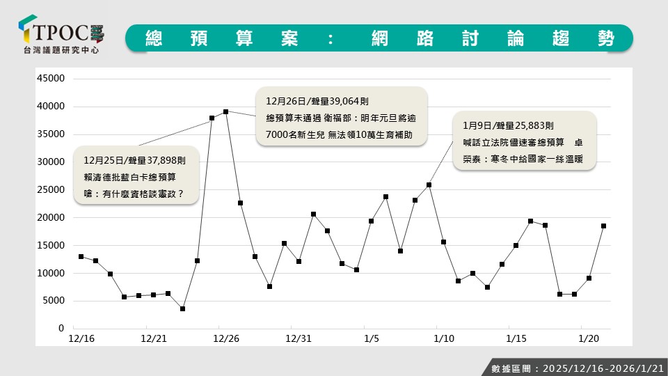 進入2026年1月後,總預算相關討論熱度仍未消退。1月9日,行政院長卓榮泰呼籲立法院儘速完成總預算審查,並以「給國家多一絲絲的溫暖」作為訴求,引發網友正反意見交鋒,當日聲量約為2.6萬則。隨後,國民黨於1月16日主張「軍人加薪」、「警消退休金」等預算項目應優先納入,並反指民進黨才是導致總預算卡關的關鍵因素。在朝野論述持續交鋒下,網路討論不僅呈現立場分化,也出現大量針對各政黨過往政策與施政表現的檢視。