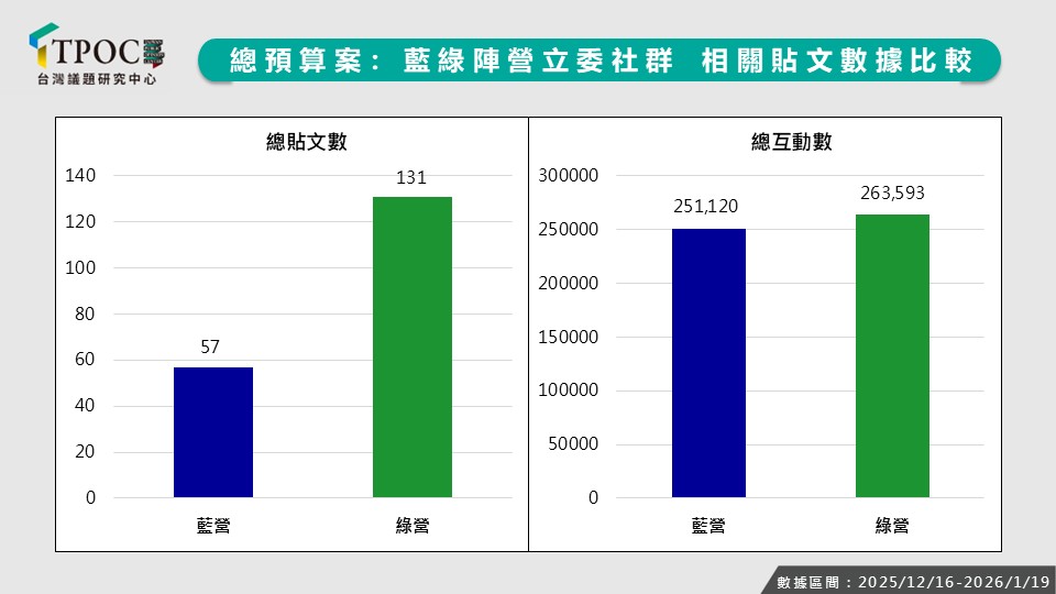 從網路數據觀察,總預算案的討論熱度高度集中於關鍵政治人物發言與政策訊息釋出的時間點,兩黨立委在社群操作方面的結果呈現明顯差異。綠營透過高頻率發文,持續推動預算儘速過關的訴求;藍營雖然發文數量較少,但單篇貼文所引發的互動表現更為突出,顯示其論述內容更容易引發網友回應與討論。隨著行政院長卓榮泰於21日主動發起與立法院的公開辯論,總預算案長期僵持的局面是否出現轉折,勢必將牽動新一波網路討論走向,後續輿情變化值得持續關注。