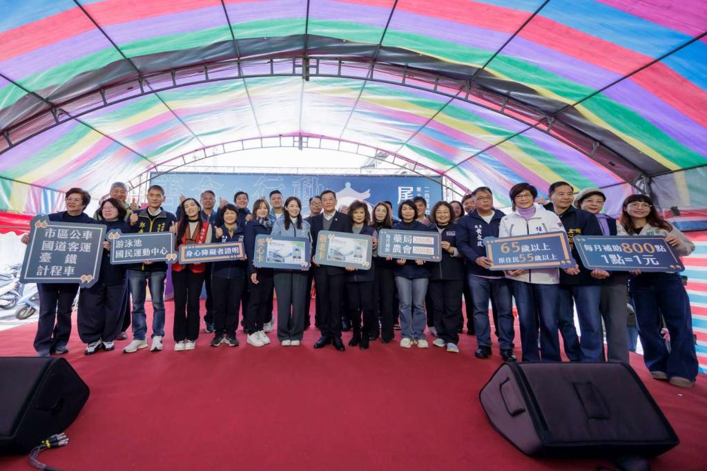▲竹蓮寺與達摩慈善功德會在竹蓮寺前廣場舉辦歲末關懷寒士、耆老及清寒家庭尾牙宴活動,新竹市議會議長許修睿和與會貴們合影。(圖/竹市府提供)