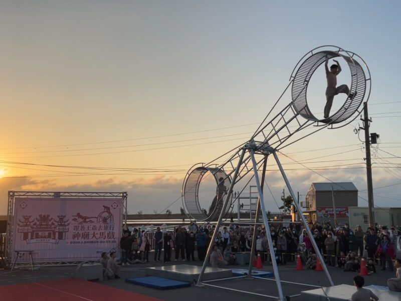 此次「神廟大馬戲」突破傳統舞台框架,將大型特技裝置移至宮廟廣場。演出團隊在高空巨輪上進行高速移動、平衡與翻轉動作,並藉由跑酷流動身法與高空走繩技巧,展現極高技術門檻與演出張力。搭配周邊鹽田美景,讓觀眾近距離感受馬戲藝術的驚險與美感,為北門廟埕地景注入全新藝術能量。現場還有精彩魔術表演互動,讓親子遊客歡笑連連。