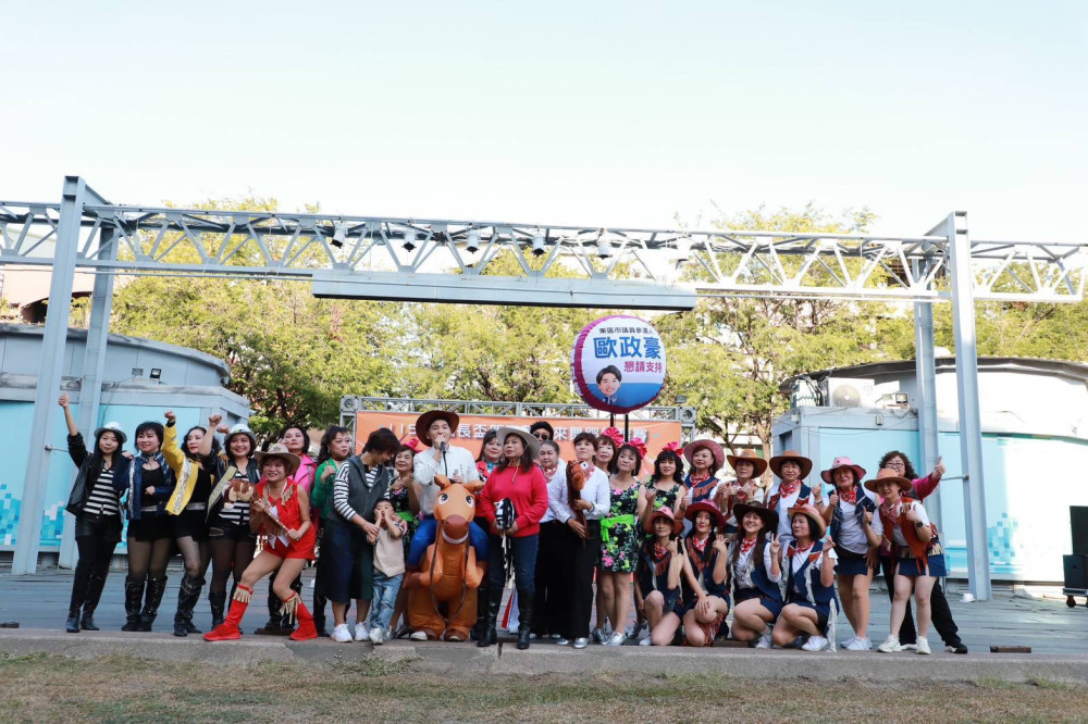 東區市議員參選人歐政豪穿小馬充氣裝登台互動,加碼舞步逗樂民眾,將氣氛推向高點,隨後與全场合照,洋溢「馬年行大運」喜氣。他表示,感動於舞者與家庭的投入,以「馬到成功」祝福新年,象徵接棒延續曾培雅的服務精神,讓臺南幸福發光。