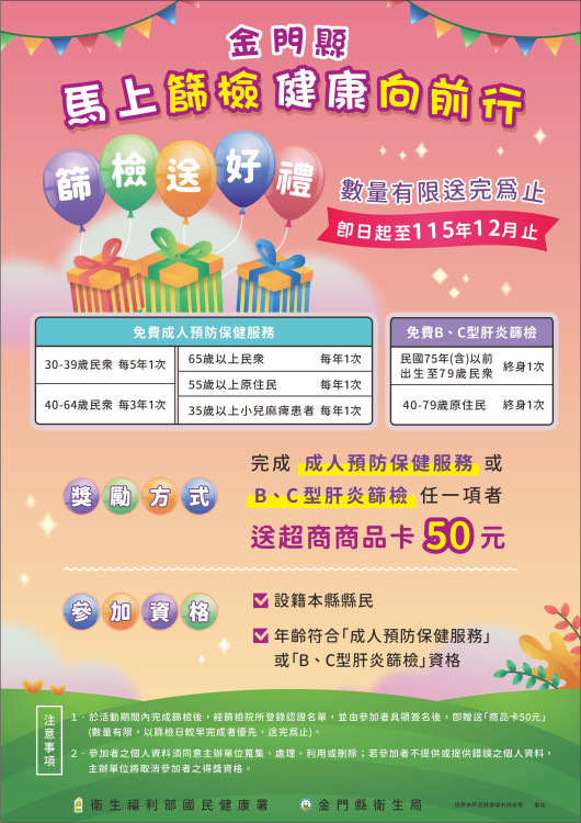 【勁報記者于郁金/金門報導】金門縣衛生局推出「馬上篩檢 健康向前行」篩檢獎勵活動,自即日起至115年12月31日止,符合篩檢資格民眾,攜帶健保卡至縣內5鄉鎮衛生所、金門醫院或合約診所,完成「成人預防保健服務」或「B、C型肝炎篩檢」任一項篩檢,可獲50元超商商品卡(數量有限,送完為止)。