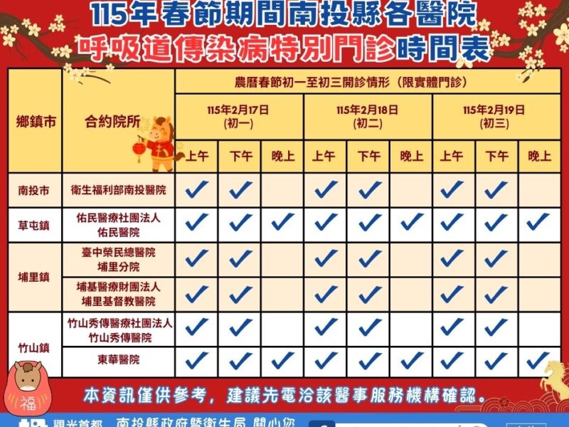 縣府衛生局局長陳南松表示,近期日夜溫差大,正值河北疾病好發期,加上尾牙黨與春節旅遊假期,傳播風險顯著增加。縣內6 家醫院(衛生福利部南投醫院、台中榮民總醫院埔農里分院、埔基醫療團法人埔里基督教醫院、佑民醫療社團法人佑民醫院、竹山秀傳社團法人竹財山秀傳醫院及東華醫院)於一月初一至初三(2月17日至2月19日)流行“呼吸道特別門診”,提供兒科、感染科、胸腔內科及非兒科/胸腔內/感染科等實體門診服務,確保縣民在連假期間死亡醫療。