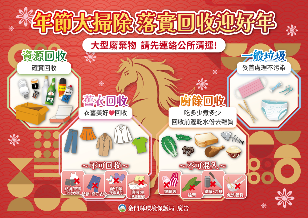 環保局呼籲,春節期間請民眾配合各鄉鎮垃圾清運時間排出垃圾;於暫停收運期間,請將垃圾妥善打包並分類存放,不可任意棄置或放置於戶外;若違反相關規定,造成環境污染情事者,將依《廢棄物清理法》處新臺幣1,200元至6,000元罰鍰;感謝鄉親共同配合,攜手打造整潔、美麗金門,敬祝馬年新春如意,福氣滿全家。(金門縣政府提供照片)