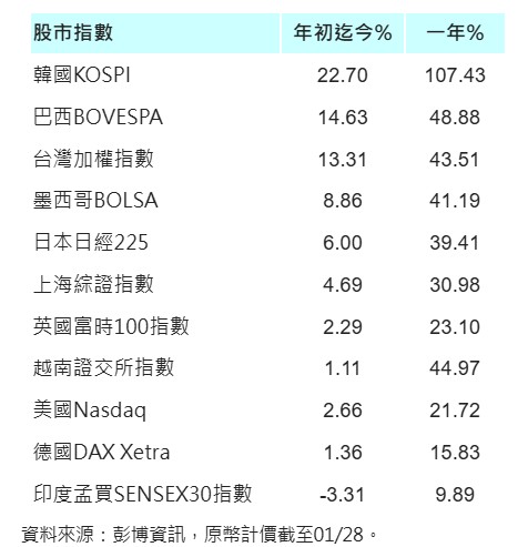 受惠美元匯價走弱、輔以AI創新題材大爆發,推動資金轉進新興市場,令新興股債資產成為全球投資版圖的焦點,2026年以來,不到1個月時間,包含亞洲市場的南韓、台灣與拉美市場的巴西股市原幣計價,漲幅均已超越一成,並同步創歷史新高價位。