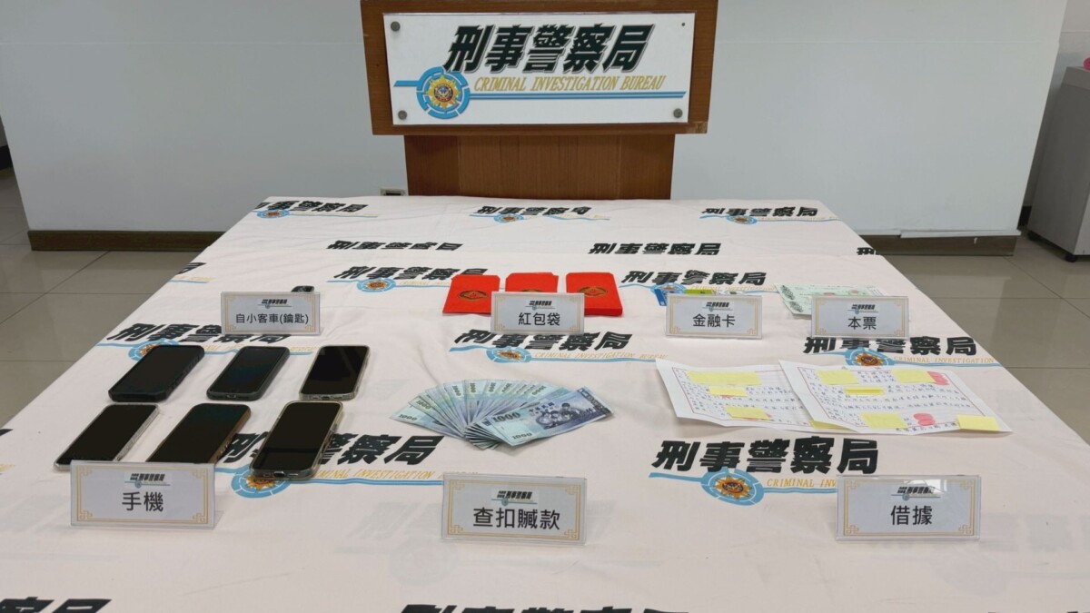 刑事警察局召開記者會展示證物,包括作案手機、金融卡、犯罪所得現金、本票以及借據。(圖:記者李佳龍/翻攝)