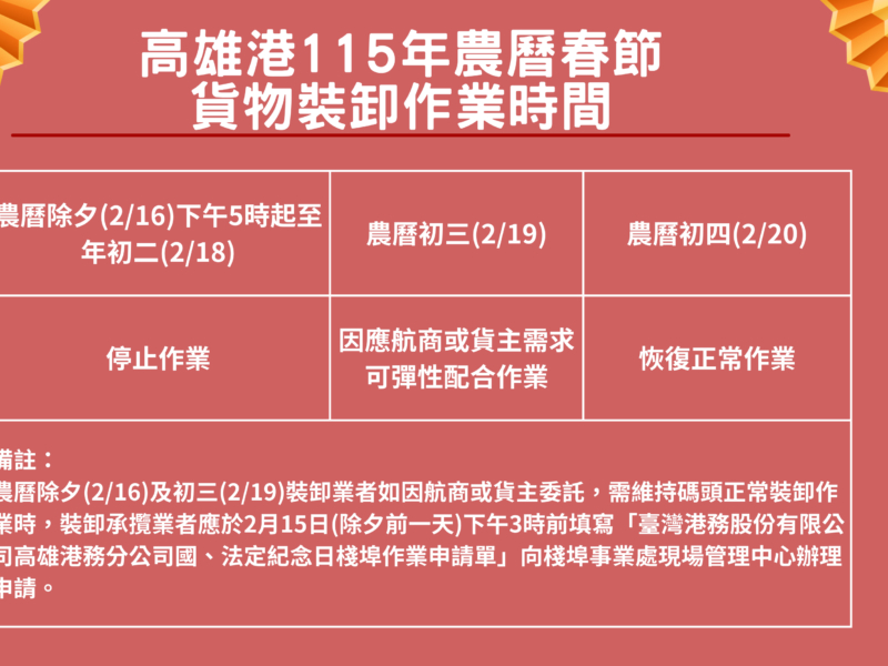 高雄港務分公司公布115年農曆春節碼頭作業時間表