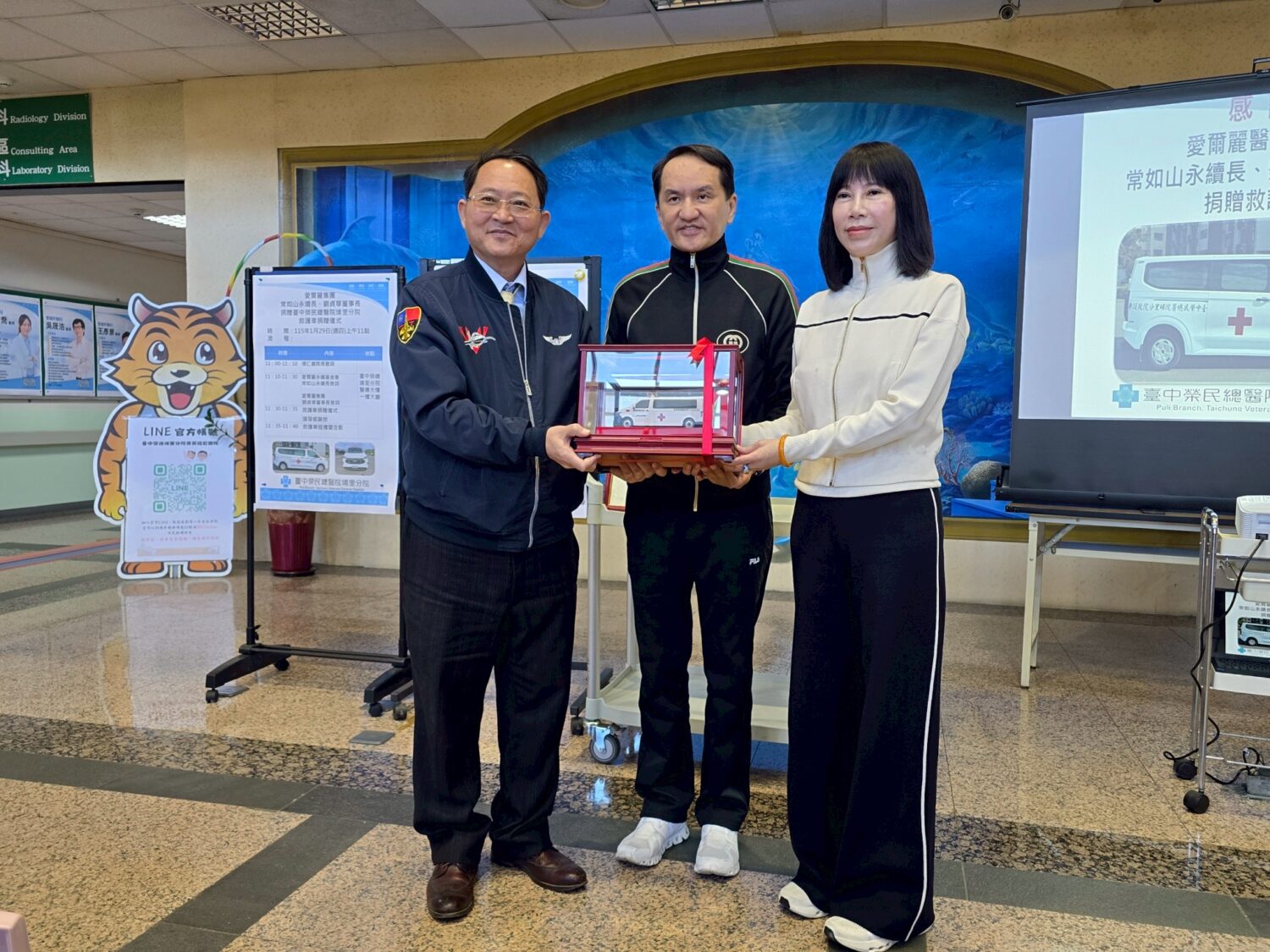 【焦點時報/記者張彥勳埔里報導】愛爾麗永續基金會常如山永續長與愛爾麗集團劉貞華董事長,長期關注並致力提升台灣緊急醫療服務設備,常永續長是榮民子弟,從捐贈救護車、復康巴士到救生船,對於慈善捐助、公益投入不遺餘力,此次捐贈臺中榮總埔里分院救護車1台,今日在該院醫療大樓一樓舉行隆重捐贈儀式,由張仁義院長代表受贈,並回贈獎狀與救護車模型,感謝常永續長與劉董事長公益善行。