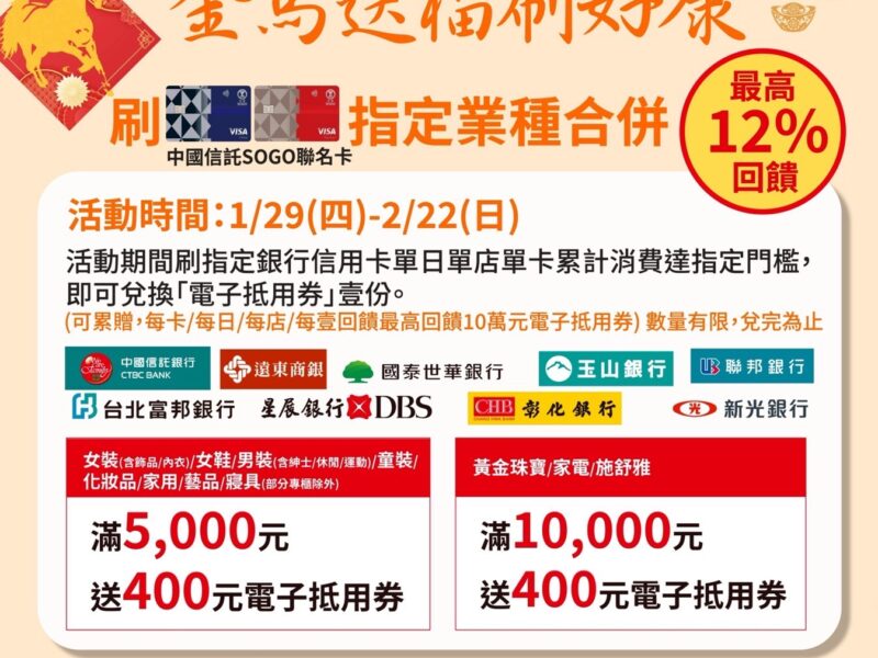 搶攻歲末採購商機 1/29(四)~2/22(日) 新竹SOGO推12%回饋