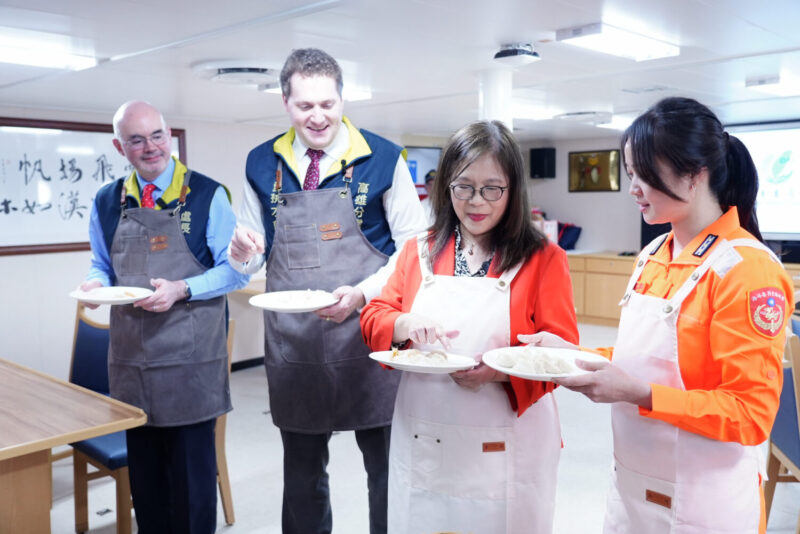 海洋委員會也應景安排「包元寶」活動,由管碧玲主委向AIT貴賓介紹,水餃象徵財富與福氣,是在台灣春節期間,全家團聚、共享溫暖的重要年節記憶,管主委甚至穿上圍裙示範如何包出飽滿的水餃,並請谷立言處長、張子霖分處長一同包元寶,為全年無休守護國土的海巡送上暖暖的心意,有趣的過程也讓艦上歡笑不斷。雲林艦石艦長也代表所有同仁獻上感謝,石艦長說,能吃到主委及AIT貴賓親手包的水餃,讓雲林艦戰力滿點!