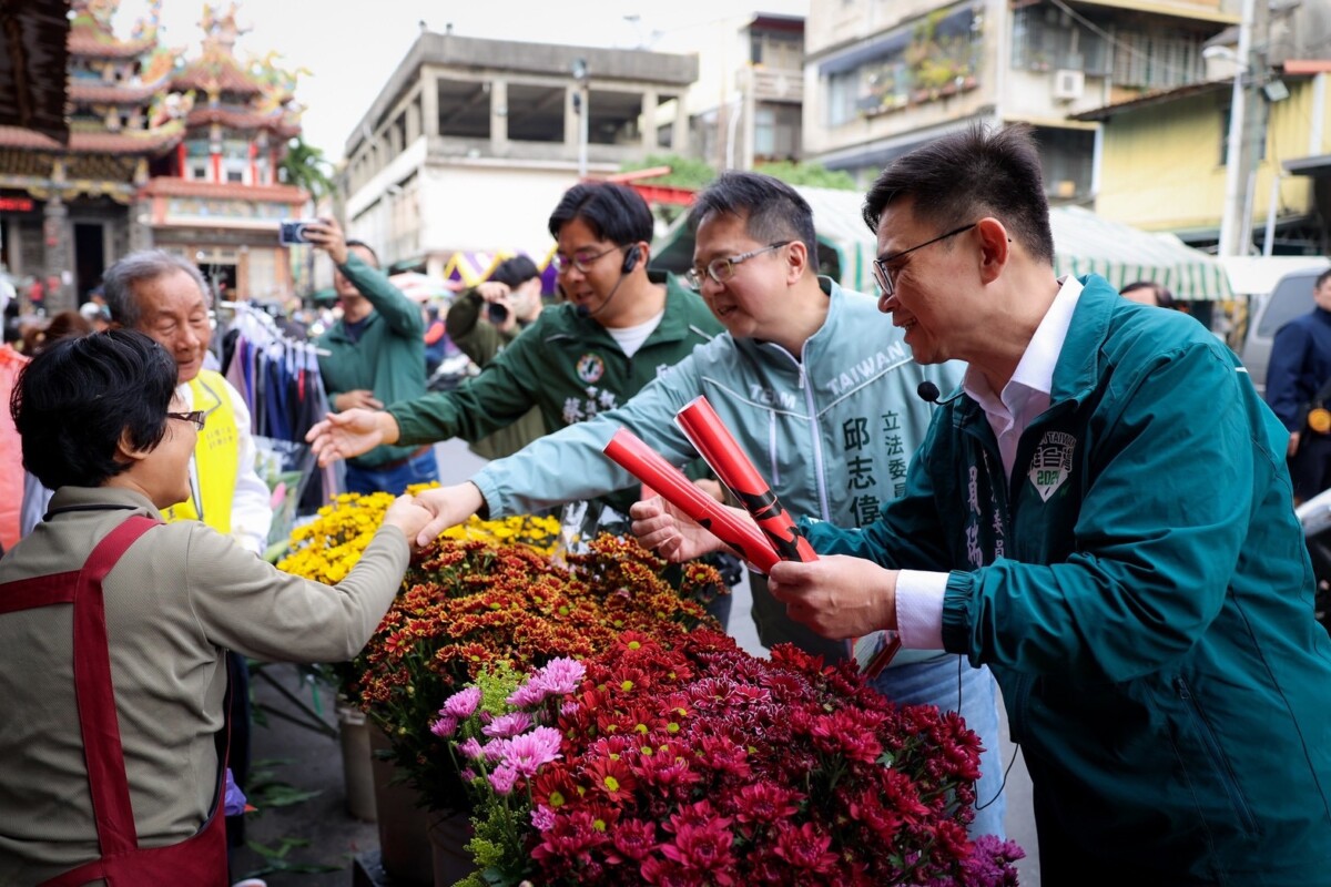 賴瑞隆發「好運隆加馬」春聯 偕邱志偉陪市議員參選人蔡秉璁走訪市場拜早年