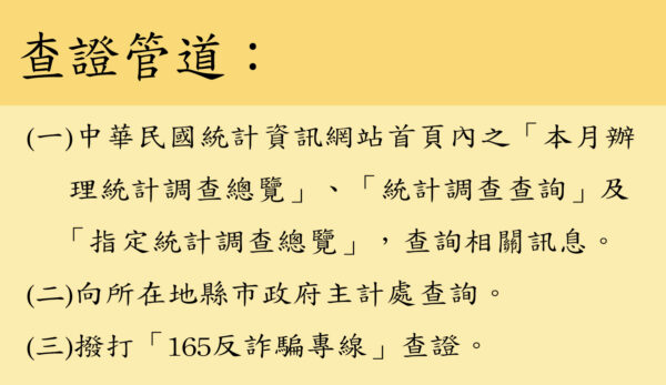訪查員於實地訪問調查前會先寄(遞)送「致受訪戶書函」或通知函,依約定訪問日期及時間按時前往訪查,訪查員亦會隨身佩戴識別證件,並於訪問完成致贈紀念品1份,以感謝民眾的協助與配合。貴戶填答之所有個別資料絕對保密,除供統計目的之用外,不作其他用途,敬請民眾放心配合查填,共同支持國家重要統計工作的推動。