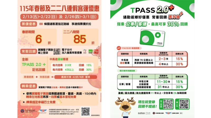 【焦點時報/記者蔡宗憲報導】春節連續假期即將到來,為照顧搭乘國道客運返鄉遠行的朋友,公路局升級推出TPASS 2.0+公共運輸常客優惠方案,每月搭乘91條中長途國道客運路線(西部70公里以上及東部國道客運路線)2次可享15%乘車金額回饋、搭乘4次可享30%乘車金額回饋,其他公共運輸則仍依既有回饋條件計算回饋金額。
