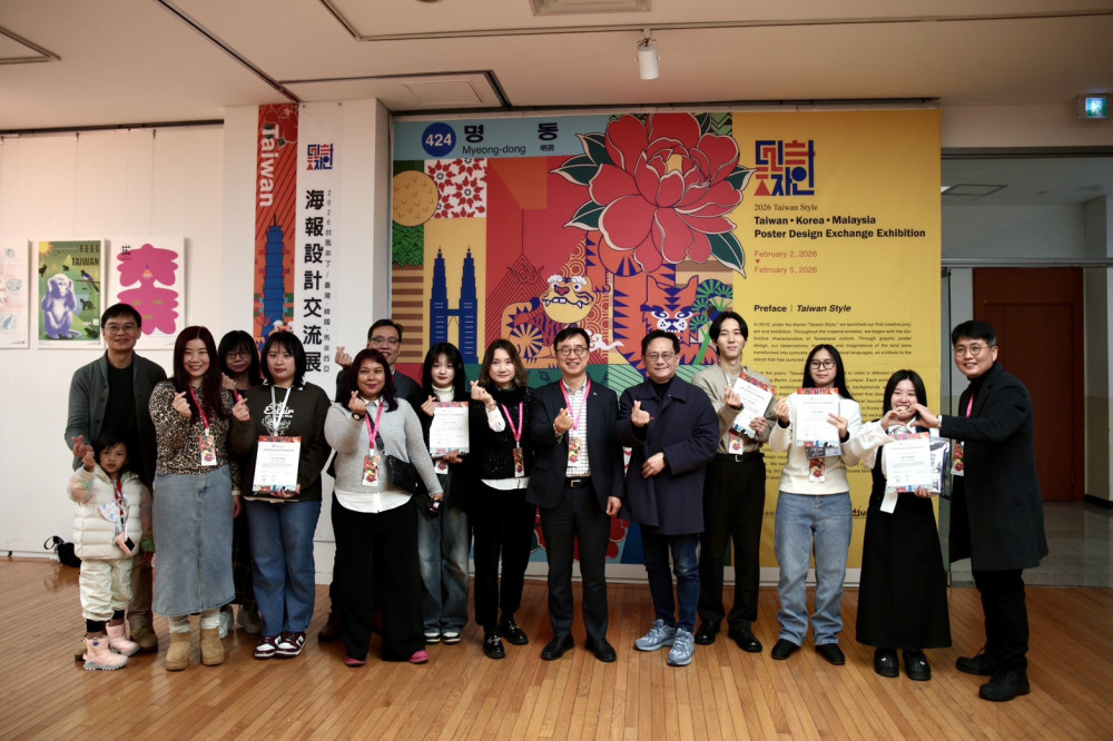 【勁報記者于郁金/臺南報導】「2026台風來了─臺灣、韓國、馬來西亞海報設計交流展」由台南應用科技大學視覺傳達設計系與韓國仁德大學視覺傳達設計系共同主辦,於2月2日在韓國首爾仁德大學舉行開幕儀式;展覽匯集臺灣、韓國與馬來西亞三國、4所大學,包括台南應用科技大學、仁德大學、馬來西亞藝術學院、勤益科技大學,共計60件海報設計作品,展現亞洲設計教育跨國交流豐碩成果。