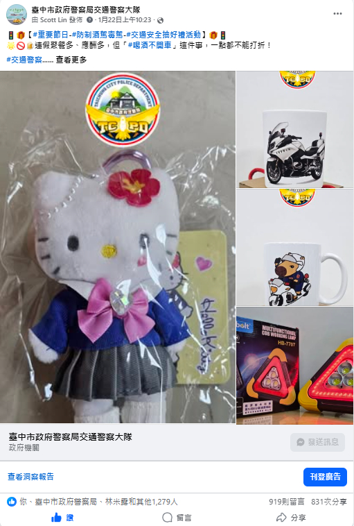 為強化交通安全宣導成效,臺中市政府警察局交通警察大隊持續透過官方臉書粉絲專頁,結合重要節日與民眾日常生活情境,推動多元且貼近生活的交通安全宣導,藉由社群平台擴大宣傳觸及層面,提升市民交通安全意識。