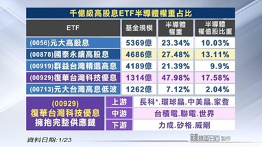 台股開春以來攻勢凌厲,半導體族群持續扮演多頭主軸,相關持股比重較高的高股息ETF明顯受惠。基金醫生馮志源分析,觀察五大高股息ETF,復華台灣科技優息(00929)的半導體權重最高,達47.98%;其次為國泰永續高股息(00878)的27.48%;而元大高股息(0056)及群益台灣精選高息(00919)的權重則約落在20%左右。
