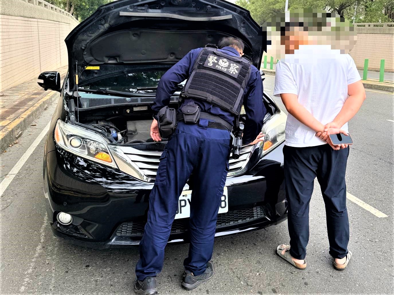 由於地下道空間狹窄視線受限,時值車輛來往頻繁流量高峰,後方來車絡繹不絕,稍有不慎恐引發追撞事故,員警擔心車流危害之虞,以巡邏車警及迅速放置交通錐於後方警示,防止交通意外發生;並經了解駕駛為35歲男子顏姓車主,其駕駛該車行經地下道時,引擎就出了狀況,沒想到還真的熄火卡在地下道。