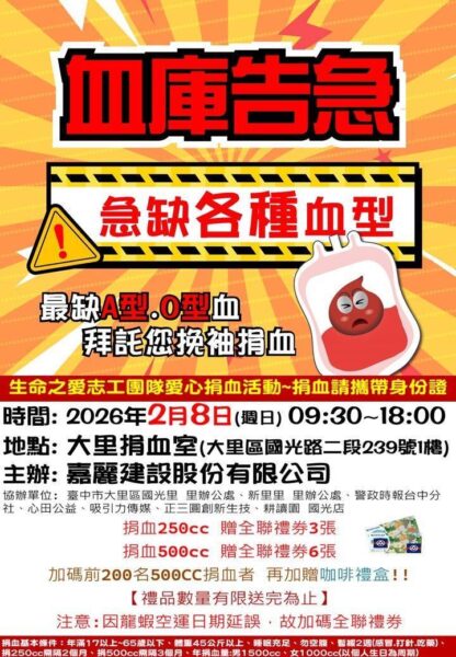 然而距離2,000袋目標仍有一段距離,關鍵最終場將於115年2月8日(星期日)在大里捐血室登場。這不僅是「愛心捐血月」第四場,更是春節前最後一波大型動員。本場活動由嘉麗建設股份有限公司攜手生命之愛志工團隊,並結合多個在地善團共同舉辦,希望在年節前再衝一波捐血量,為血庫補足安全存量。
