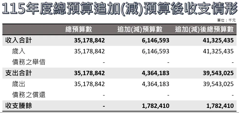 南投縣115年度總預算第一次追加(減)預算案,今(9)日經南投縣議會第20屆第19次臨時會審議通過,歲入淨追加預算數61億4,659萬3,000元,歲出淨追加預算數43億6,418萬3,000元;加計115年度法定預算數後,追加(減)後總收入數及總支出數各為413億2,543萬5,000元及395億4,302萬5,000元,未編列債務舉借及償還預算,總收入與總支出相抵後仍有賸餘17億8,241萬元,展現縣府在積極推動縣政建設之餘,仍能維持財政穩健的成果。
