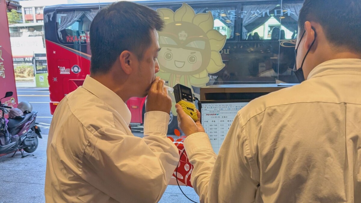 客運業者落實出車前酒測與健康監測,由監理所同仁現場督導駕駛員執行酒精檢測與簽到流程,嚴格把關行車安全第一道防線。(圖:記者李佳龍/翻攝)