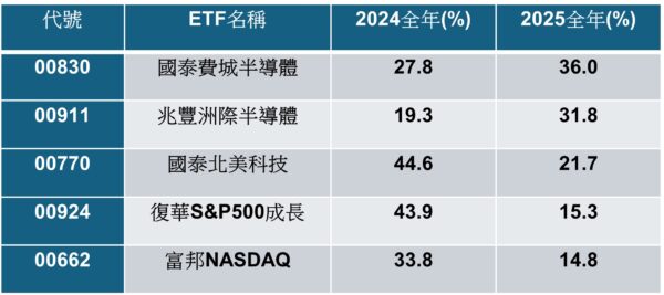 第四名則為復華S&P500成長(00924),受惠於高權重配置美股大型科技股,包括輝達、微軟與亞馬遜等,全年漲幅逾15%。雖然表現不及半導體類ETF,但仍優於富邦NASDAQ(00662)與統一FANG+(00757)等科技型ETF,在市值型美股ETF中表現最為突出。