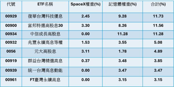 高股息ETF配置SpaceX、記憶體合計權重排行