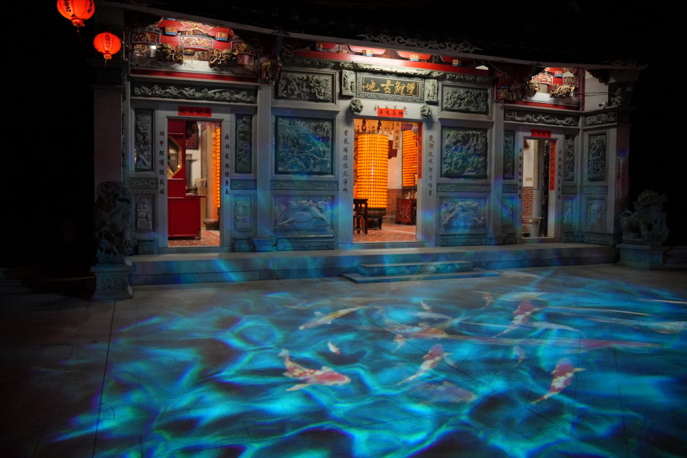 雙鯉古地關帝廟及保靈殿則運用投影技術呈現水波與錦鯉意象,呼應地方地名與信仰文化,寓意花開富貴、年年有餘。
