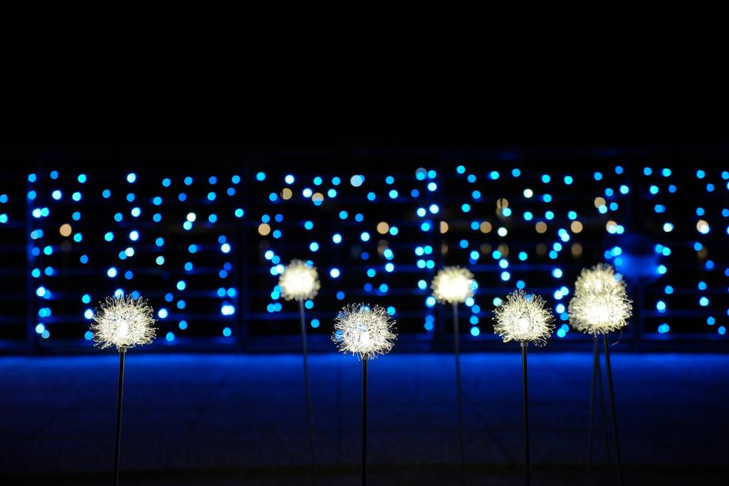 南山步道復刻2021年金門燈會經典燈光作品「比翼雙飛—在愛裡迎光飛翔」,以鸕鶿裝置搭配湖面倒影,呈現攜伴歸巢意象,象徵家庭凝聚與情感延續;特別的是,步道沿線點綴蒲公英燈,象徵希望與祝福,引領民眾走向光明未來。