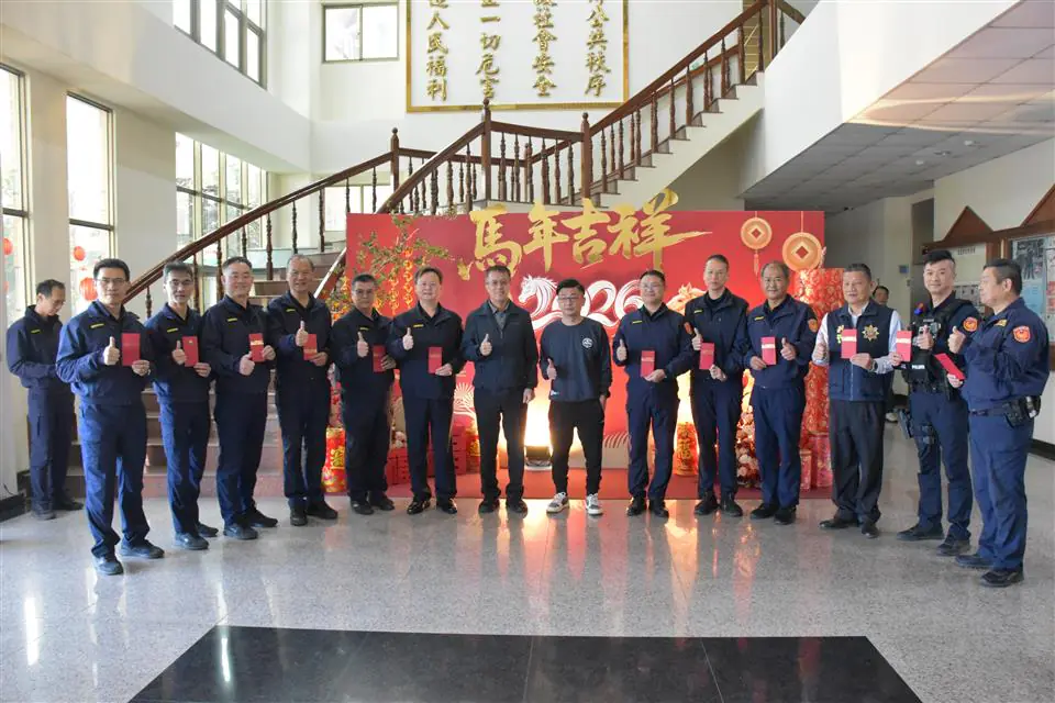在慰勉儀式中,謝議長親切地與田中義警中隊、民防中隊、志工中隊及分局同仁交流,他致詞時強調,春節是團圓時刻,警察同仁與協勤民力犧牲假期加強巡守,換來社會的平穩;他代表縣民致上最深謝意,並與同仁合影留念,士氣大振。隨後,議長一行人轉往分局禮堂,參觀由知名書法家許仁東老師率領「逸東書道館」大師們舉辦的「新春揮毫送春聯」活動,議長親自為老師們加油打氣,老師們也特別書寫了專屬議長的「姓名藏頭春聯」致贈留念。現場展示了結合「反詐、交通宣導」理念的創意春聯,將傳統藝術與現代警政宣導完美結合。