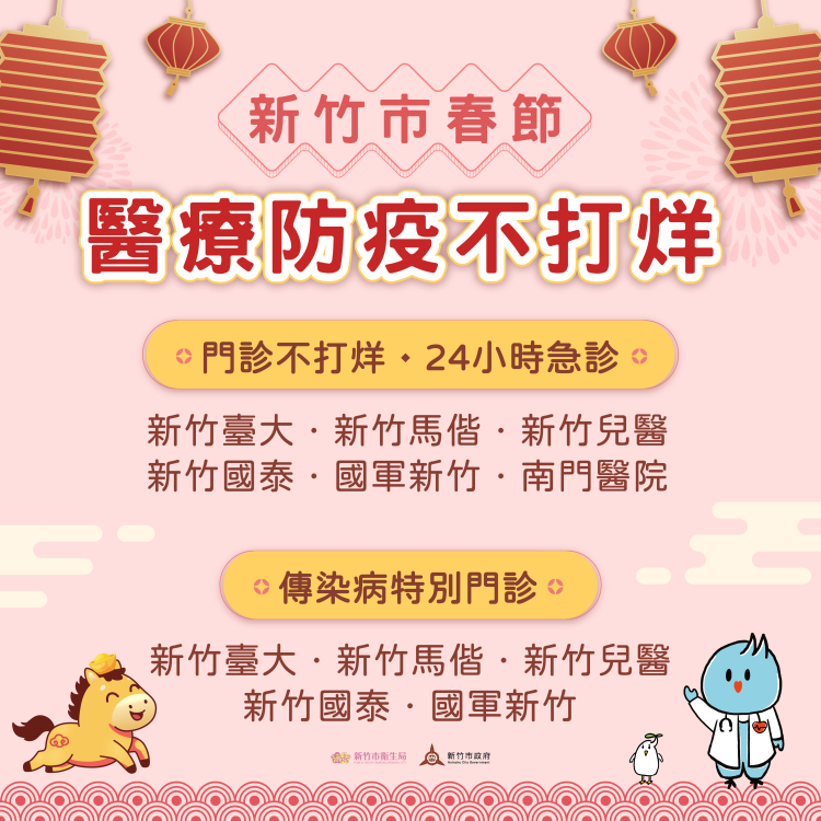 好運奔「馬」來,健康迎新年!農曆春節即將來臨,今(115)年農曆春節連假長達9天。為確保市民朋友於年節期間仍能獲得即時、完善的醫療照護,新竹市衛生局已事前完成整體規劃,協調全市6大急救責任醫院於春節期間提供24小時急診服務不打烊,並安排部分門診科別及時段照常開診。同時,亦開設「傳染病特別門診」進行分流看診,降低交叉感染風險,讓市民朋友在春節期間就醫更安心,健康迎接嶄新的馬年。