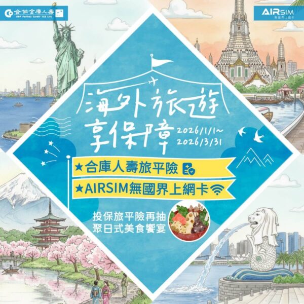 長達9日的馬年年假,還沒規劃旅平險的民眾請把握機會!合庫人壽推出「海外旅遊享保障」活動,提供全方位守護,再送上網卡百元折扣!只要使用合庫人壽線上投保,不論新註冊或既有會員登入,即送AIRSIM實體上網卡百元優惠或eSIM儲值金新臺幣(下同)100元,旅平險加無國界上網卡,線上線下逍遙遊!除了即時領取的百元上網優惠,投保成功還可參加抽獎,有機會獲得價值1,000元的聚日式鍋物雙人餐券,再抽AIRSIM海外上網數據充值券!活動網址:https://lihi.cc/vtXfY