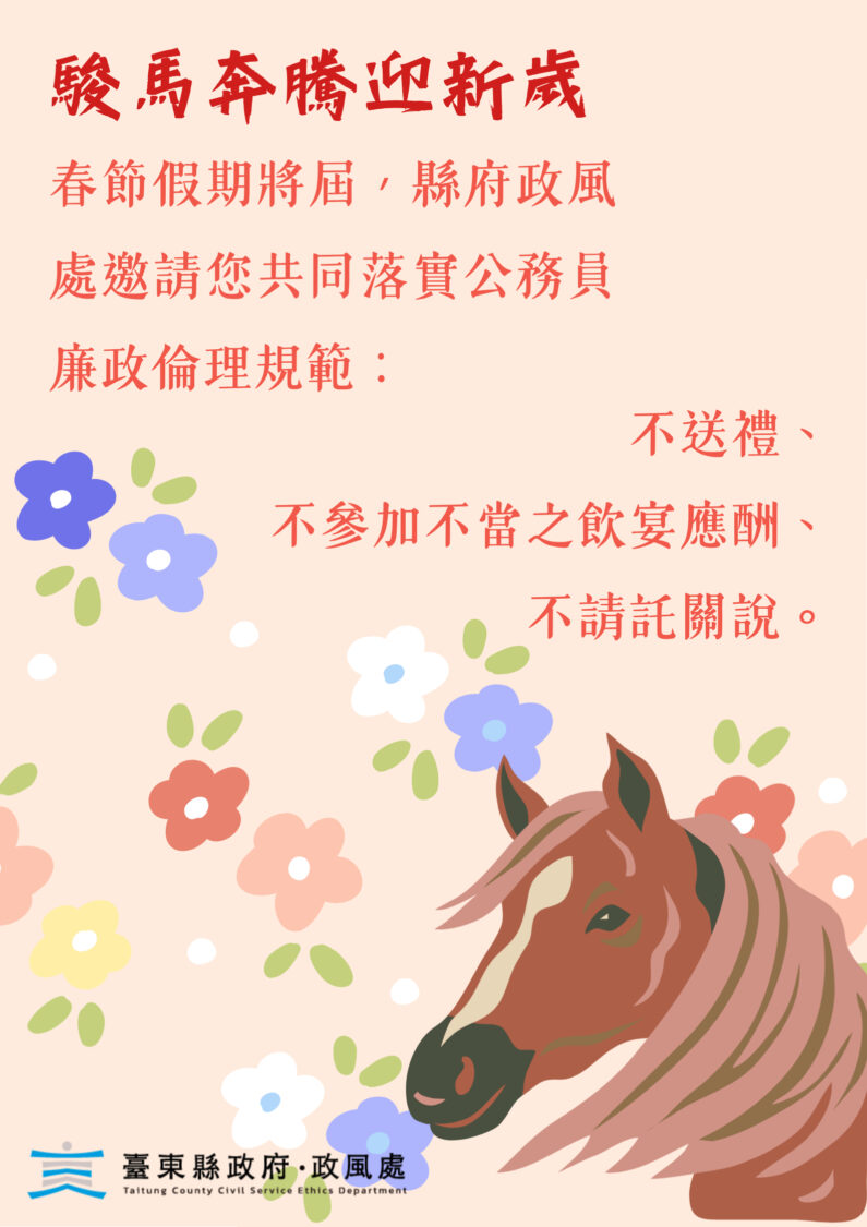 農曆春節9天連續假期將至,臺東縣政府團隊祝福鄉親朋友馬年開泰,並期盼於新的一年引領臺東再創施政佳績,縣府政風處也籲請民眾,於洽公時,毋須送禮、勿邀飲宴、不關說請託,共同延續臺東清新優質風氣。