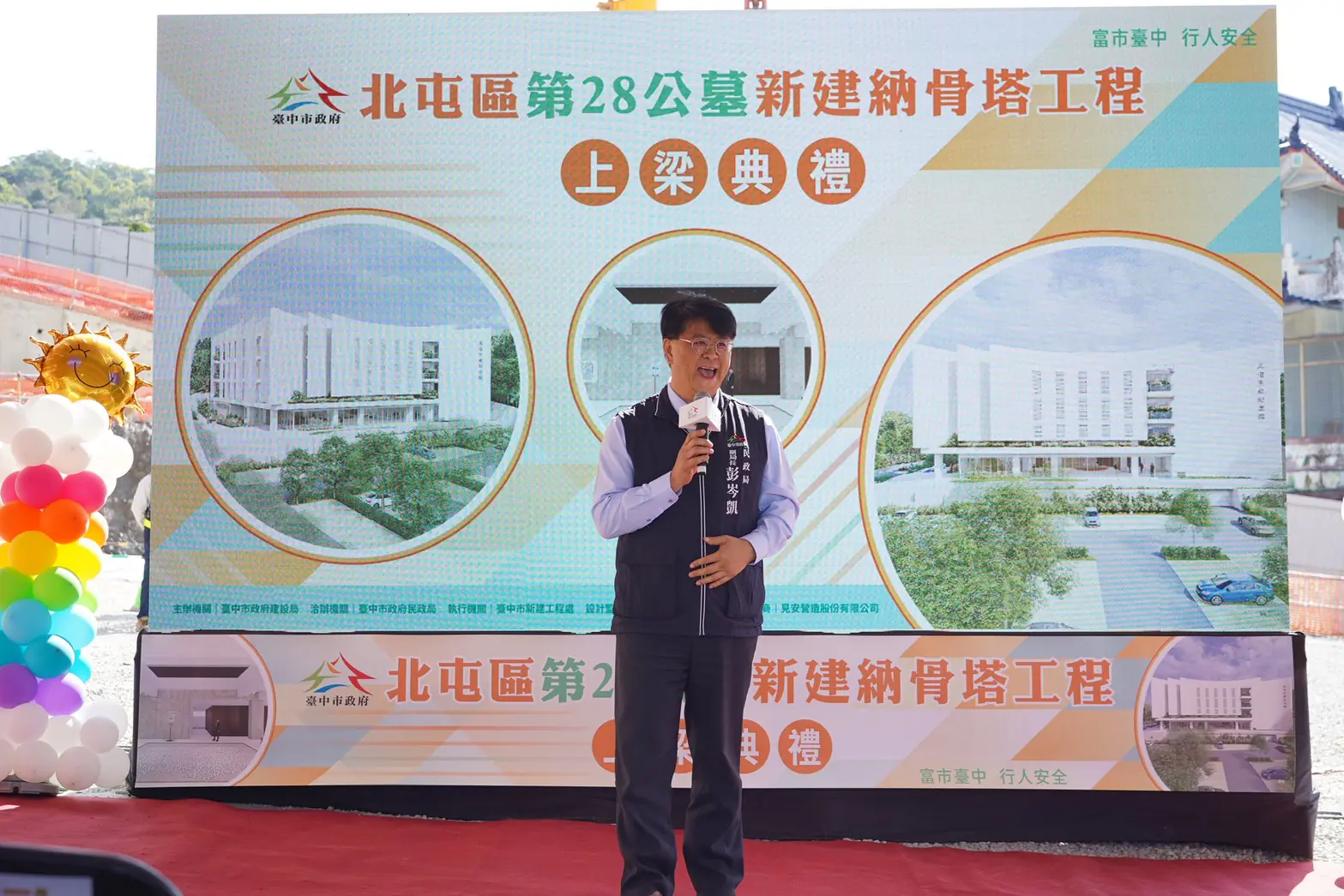 台中市長盧秀燕重視民眾對殯葬設施的實際需求,近年持續推動殯葬服務建設。市府建設局與民政局跨局處合作,斥資7億5,422萬元推動「北屯區第28公墓新建納骨塔工程」,並於今(11)日舉行上梁典禮,由民政局副局長彭岑凱代表盧市長主持,工程預計於116年4月完工,未來將打造兼具人文關懷與安寧氛圍的空間,實踐「來者以遊、生者以慰、逝者以安」理念,完善地方治喪需求。