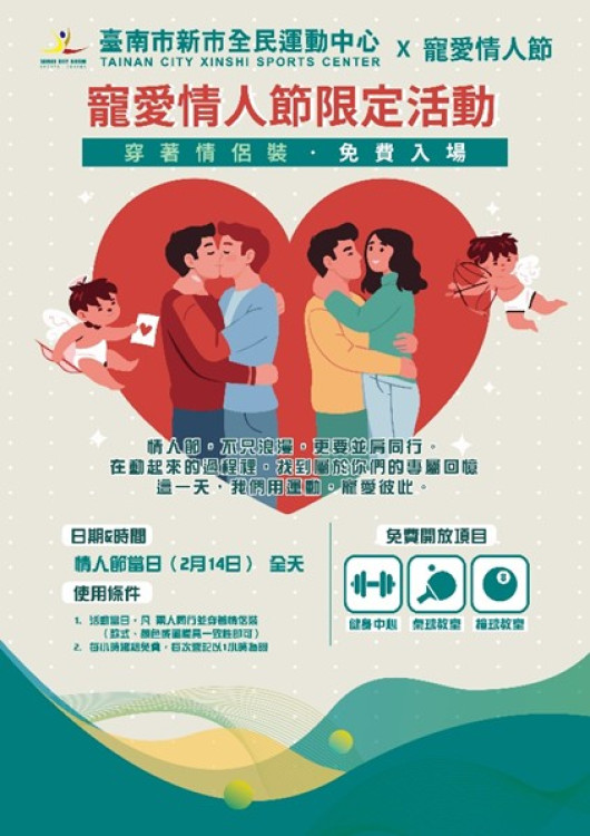 新市全民運動中心則於 2 月 14 日情人節當天推出情侶裝限定活動,兩人穿情侶裝到場,可免費體驗健身房 1 小時,以及桌球或撞球 1 小時,以趣味運動形式,讓運動成為情感交流的紐帶,提升民眾進館運動意願。