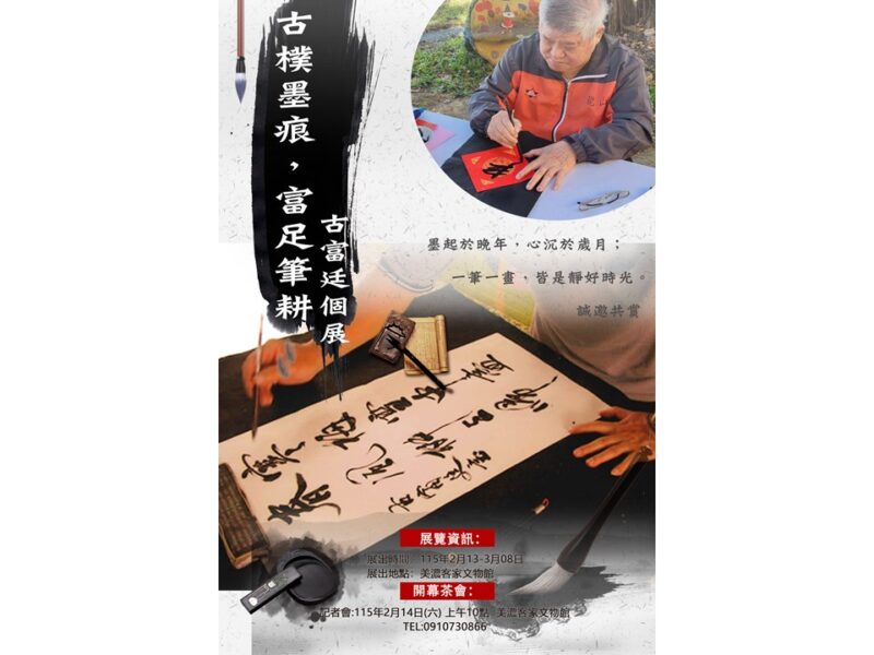 【焦點時報/記者蔡宗憲報導】美濃客家文物館即日起至3月8日舉辦「古樸墨痕.富足筆耕—古富廷書法展」,共展出在地知名教育者古富廷主任36件墨寶及多幅應景春聯,作品涵蓋篆、隸、楷、行、草五體書法,呈現其半生書藝創作成果,並於今(14)日(星期六)上午辦理開幕茶會,展現深厚的人文底蘊與藝術能量。
